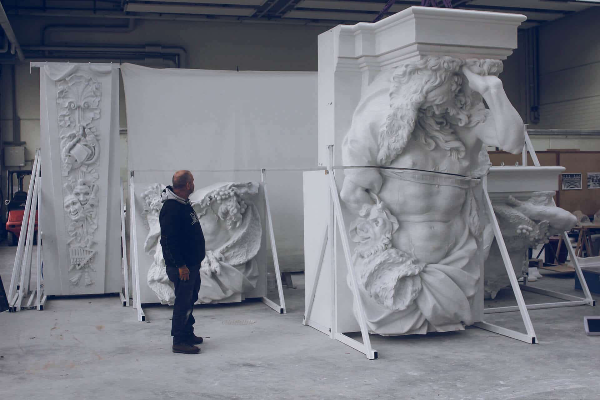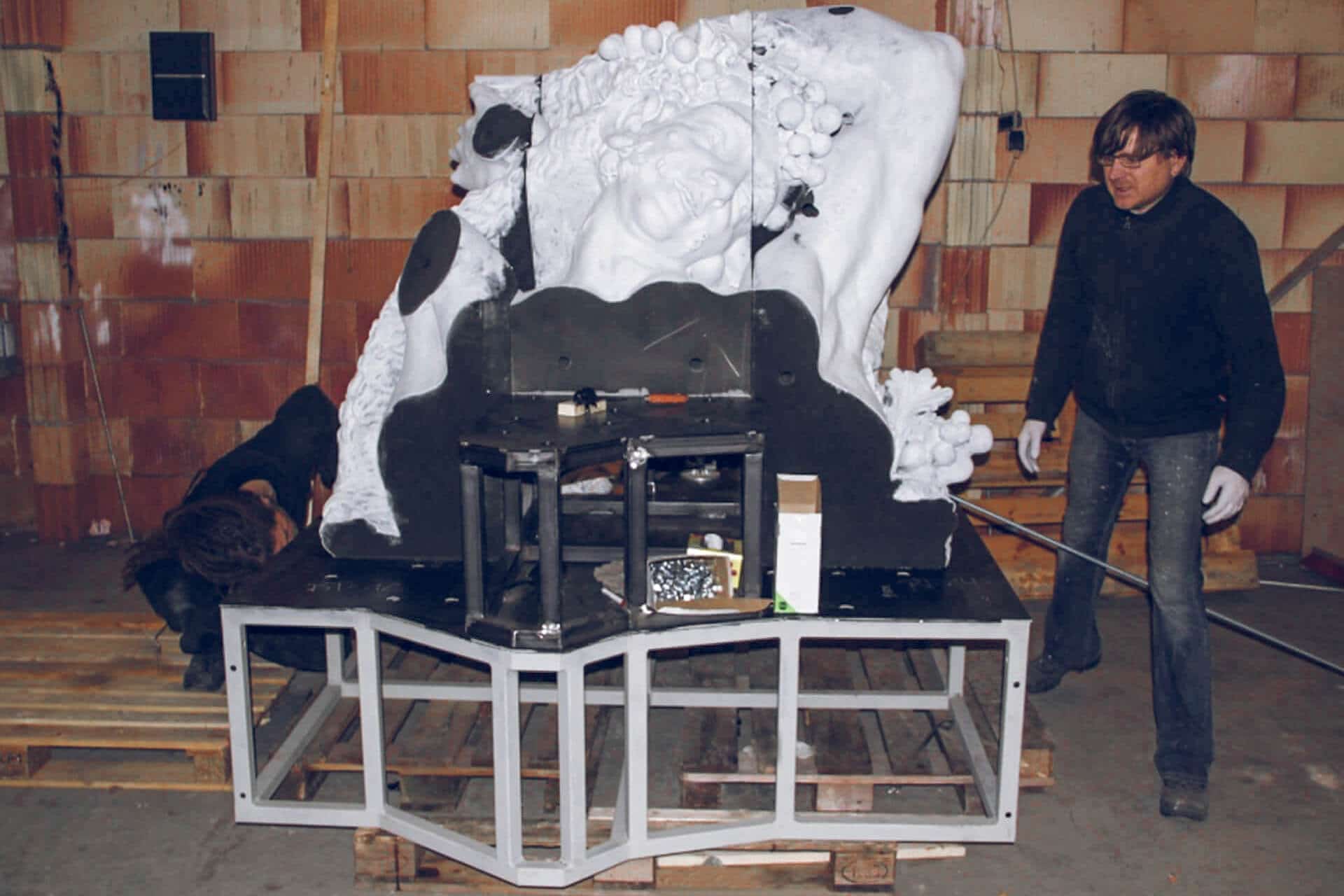 此項目的挑戰(zhàn)是為雕塑家制造一個精確的模板,讓他們可以打造復(fù)制件。因為必須謹慎處理原塑像,所以傳統(tǒng)的塑造技術(shù)未被選用。負責人決定使用創(chuàng)新的復(fù)制方法法代替:不需接觸塑像的3維掃描,以及3維砂型打印法的實體打造。駐于當?shù)氐陌亓謷呙鑼<?a class="external-link-new-window" title="Visit here the company Trigonart" target="_blank" rel="noopener noreferrer">TrigonArt專注于3維測量。他們接受了次項目的掃描任務(wù),并制定了塑像的高像素整體模型。此外,特定部分如塑像肢體被作為單一的3維模型制作,并分割為60個單一部分進行實體打造??紤]到為確保穩(wěn)固而納入的建筑鋼材,此預(yù)備措施意味著非常復(fù)雜的策劃任務(wù)。之后由3維打印的實體模型生成是奧格斯堡voxeljet 服務(wù)中心的任務(wù)。在查閱數(shù)據(jù)后才體現(xiàn)此打印工作的全面性和復(fù)雜性:“此任務(wù)包括100個單一工作,其中包含1.5×1.0 x1.0米的模型維度。
