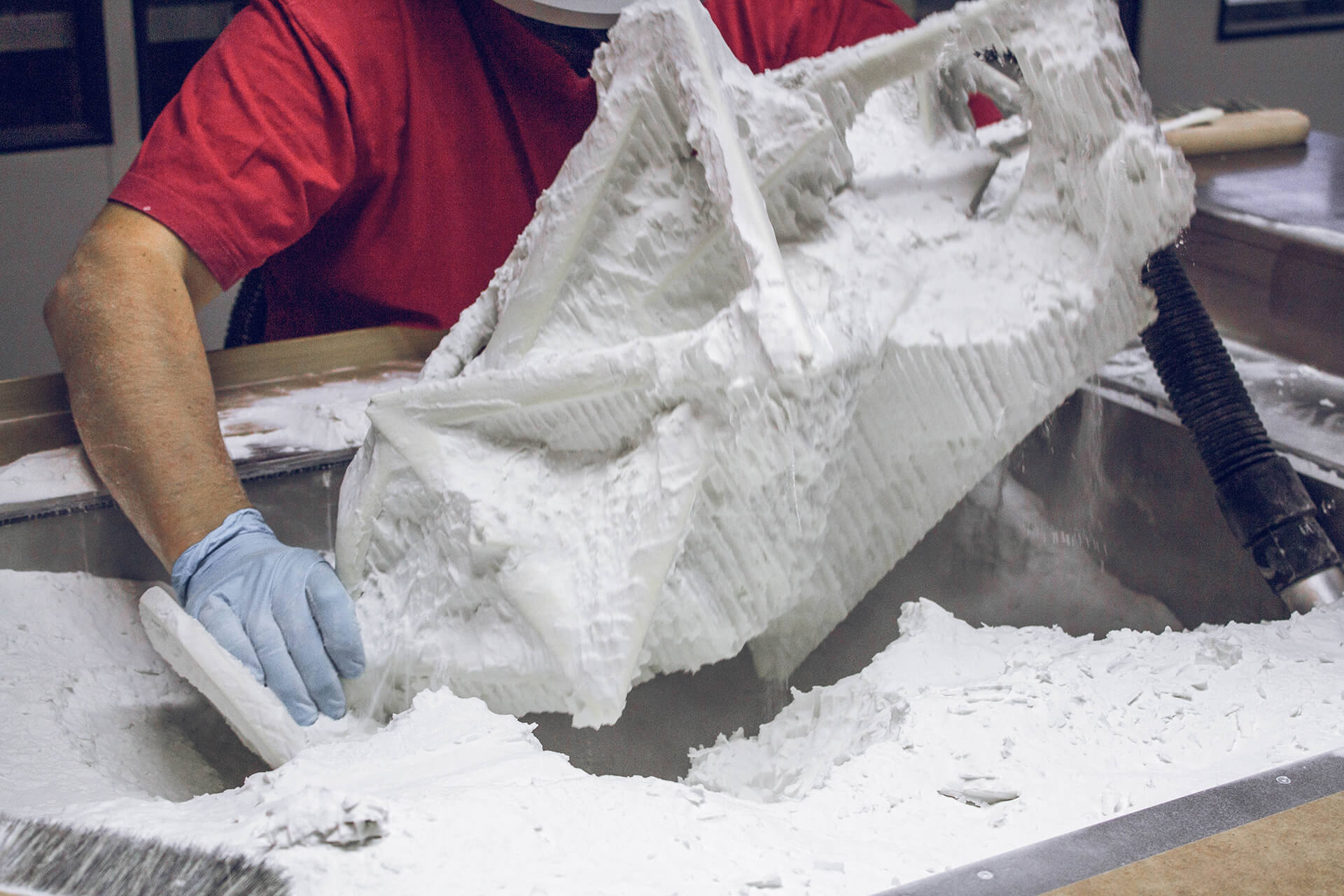 一旦打印完成,維捷的員工便將模型從工作箱中移除,清除可以100%重復(fù)使用的未粘合的塑料粉末,用蠟澆鑄部件,以便進(jìn)一步修平表面,然后將凸型模型發(fā)送給 Strassacker。在下訂單之后的3—5天內(nèi),模型已經(jīng)在Strassacker現(xiàn)場等待進(jìn)一步的加工。