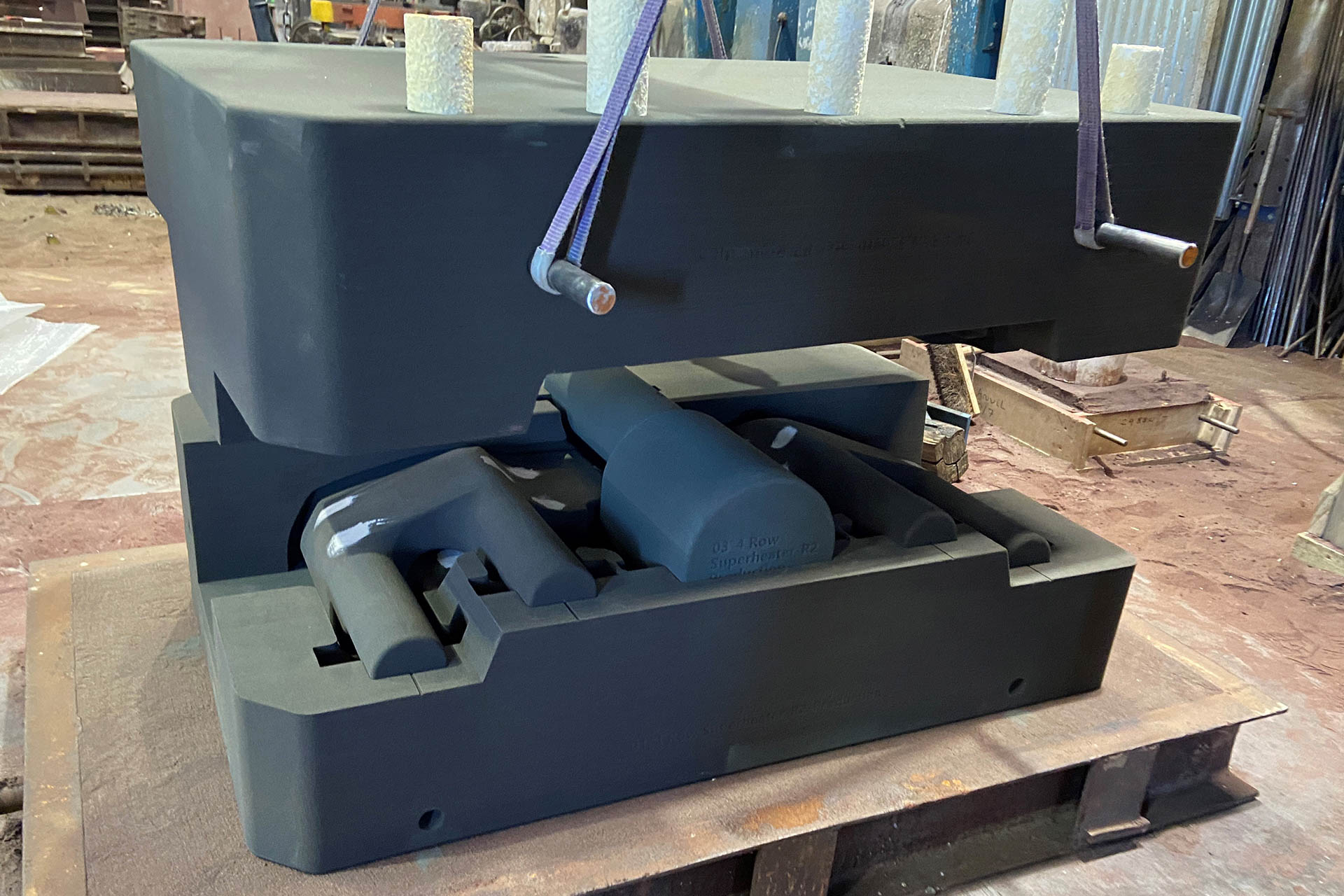 在實(shí)際澆注之前,Boro模擬了澆注過(guò)程,以設(shè)計(jì)一個(gè)閘門(mén)系統(tǒng),減少澆注壓力和相關(guān)的巖心侵蝕或移動(dòng)的風(fēng)險(xiǎn)。此外,模擬有助于預(yù)測(cè)鑄造過(guò)程中的氣體涌動(dòng),并減少氣體夾帶的風(fēng)險(xiǎn)。Boro隨后在大約1330℃的溫度下鑄造了大約550公斤的鐵水。Tyseley機(jī)車(chē)廠(chǎng)的新過(guò)熱器尺寸為1300mm x 600mm x 400mm,重量為406公斤。